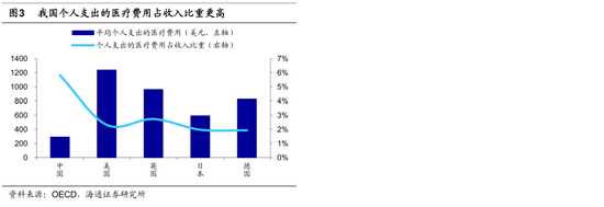 医疗方面,“看病难看病贵”是一直以来盘踞在我国人民心中的重要民生问题,其实如果我们和国外主要发达国家做对比,可以发现我国的医疗体系中整体医疗费用其实并不算高,医疗卫生支出在GDP中的占比也是明显更低,那“看病难看病贵”究竟源自何处?OECD的数据一定程度上解释了这一现象:2020年我国的所有医疗相关开支中,个人支出,也就是政府和商业医疗保险无法覆盖的占比高达36%,而在美国个人需要自行支付的部分仅占医疗总费用的11%,这个比例在其他发达国家也普遍不到20%。从相对人均可支配收入的角度看,20年我国个人支出的医疗费用占比为6%,而美国和其他海外主要发达国家均在2%左右,可见我国居民需要自行承担的医疗费用压力明显更大。