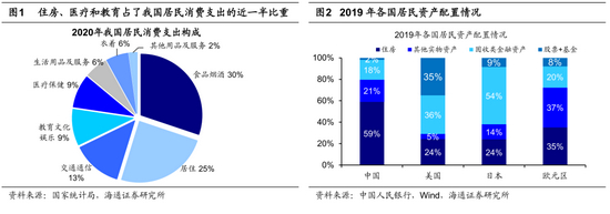 住房方面,房屋资产在我国家庭的总资产中占据着半壁江山,根据央行公布的数据,2019年住房占了我国家庭总资产的近60%,比美国居民家庭高出了约35个百分点。从开支的维度看,2020年我国居民总开支中25%用于居住支出,相比之下美国的占比只有19%,住房开支带给我国居民的成本压力明显更高。