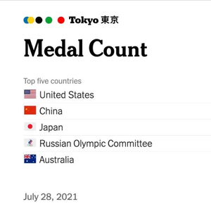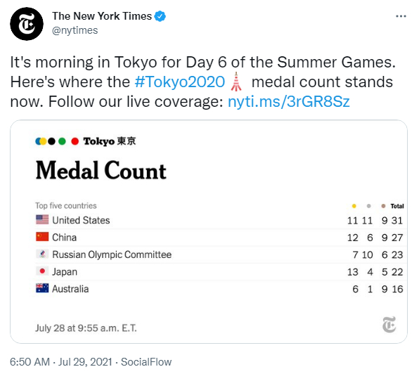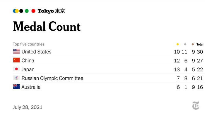 7月28日,《纽约时报》在其推特账号上发布了奥运第5日的奖牌榜,在这份榜单上,美国名列榜首,中国和日本分列二、三位。
