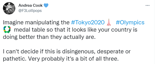 还有人指出,除了美国,世界其他地方都是以金牌来排序,按此标准,前三位应该是日本、中国、美国。这位网友还质问:“为什么你们总是要编造一些东西,让你们看上去比实际状况好很多?”