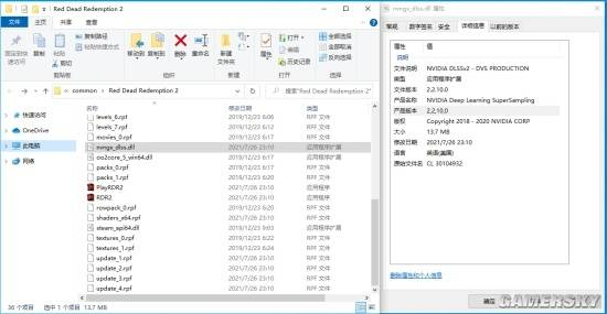 在"nvngx_dlss.dll"的文件信息中,我们可以了解到,这次《荒野大镖客:救赎2》采用的是NVIDIA最新的DLSS2.2技术。接下来就让我们一起来看看,在开启DLSS2.2之后,玩家们能够获得多少游戏帧数的提升。