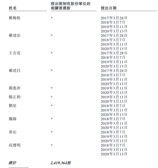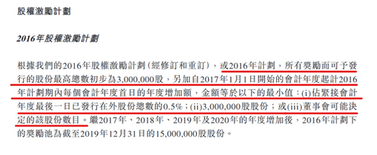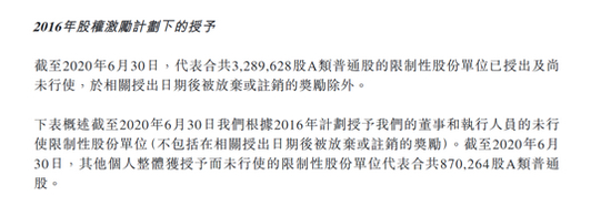 截至2020年6月30日,该项计划下一共授出限制性股份单位3,289,628股,其中授予董事会及高管层的股份2,419,364份,占已授出总数的73.55%;授予其他个人或集体的限制性股份单位870,264股,占已授出总数的26.45%。