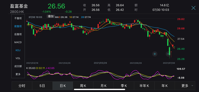 盈富基金周四收报26.84元,涨3.07%。截止周五发稿,盈富基金跌1.04%,报26.56%。