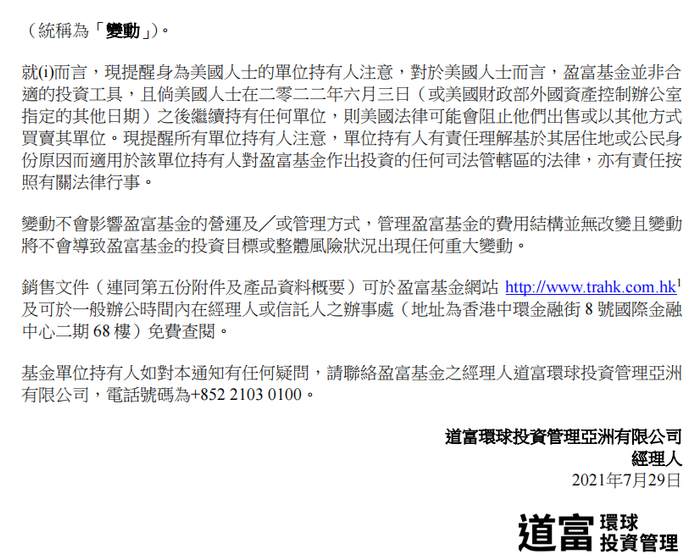 财联社(上海,编辑 周玲)讯,盈富基金的经理人——道富环球投资管理亚洲有限公司周四(29日)收盘后发布公告,已修订销售文件内容,明确规定基金单位不得向“美国人士”发售。