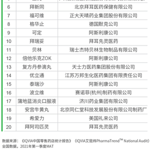 2021年第一季度MAT销售额排名前20的处方药产品