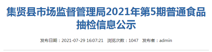 原标题:黑龙江省集贤县市场监管局公示2021年第5期普通食品抽检信息
