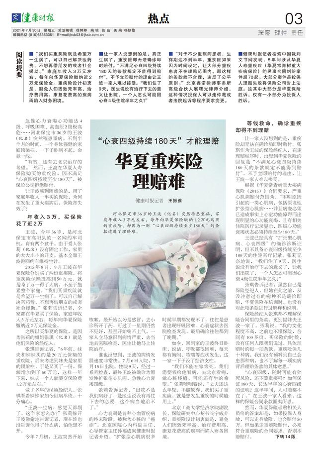 阅读提要■“我们买重疾险就是希望万一生病了,可以自己解决医药费,不想再借朋友的或者社会援助。”让一家人没想到的是,真正生病了,重疾险却无法确诊即时赔付。“不满足心衰四级持续180天的条款规定不能得到赔付”,不予立即赔付的理由让王波一家人难以接受。“我们住了9天,医生说没有治疗下去的意义让出院,一个人怎么可能因心衰4级住院半年之久?”■健康时报记者检索中国裁判文书网发现,5年间涉及华夏人寿重疾险(华夏常青树重大疾病保险)的民事合同纠纷案件超70起。大部分案件是投保人理赔失败将保险公司告上法庭。这其中大部分是华夏保险胜诉,仅有一小部分为投保人胜诉。