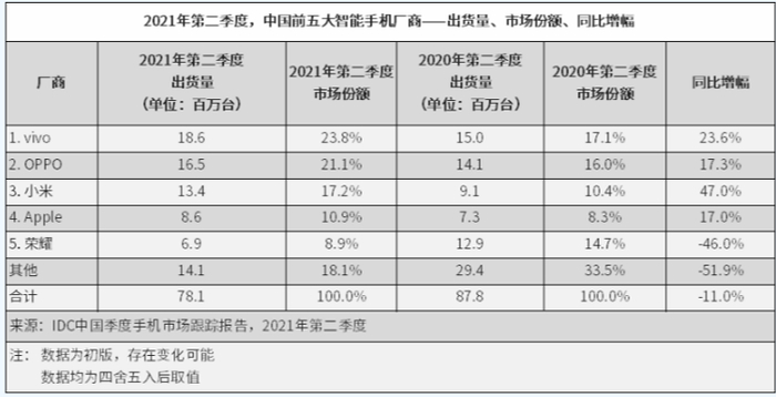 IDC最新发布的今年第二季度国内市场手机出货量报告显示,vivo、OPPO、苹果、小米、荣耀成为国内前五大手机厂商,且前四大厂商增长迅速,华为失去的底盘正在由这些企业瓜分,尤其是在高端市场,苹果成为最大的受益者。
