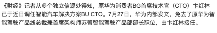 近日,据财经报道,自去年开始,华为手机团队中层以上领导就在不断流向其他部门。而在苏箐因发表特斯拉杀人等不当言论被免去智能驾驶产品部部长后,原华为消费者BG CTO卞红林接任了该职位。