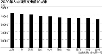 第一财经记者统计了35个主要城市2020年人均消费支出,有16个城市的人均消费支出超过3万元大关,除长沙之外,全部来自东部沿海地区。其中有三个城市人均消费支出超过4万元,分别是上海、广州和深圳。