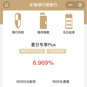 除了不断探索创新产品之外,中小银行在各式积分换礼营销活动上也不遗余力。目前华瑞银行正开展存款送高额积分的营销活动,在该行微信小程序界面,最新热推的夏日专享Plus7天通知存款最为引人注目,在该行的宣传资料中,该产品7日年化综合收益率高达6.969%。产品只销售4天至7月31日,5万元起存,单人限购20万元。