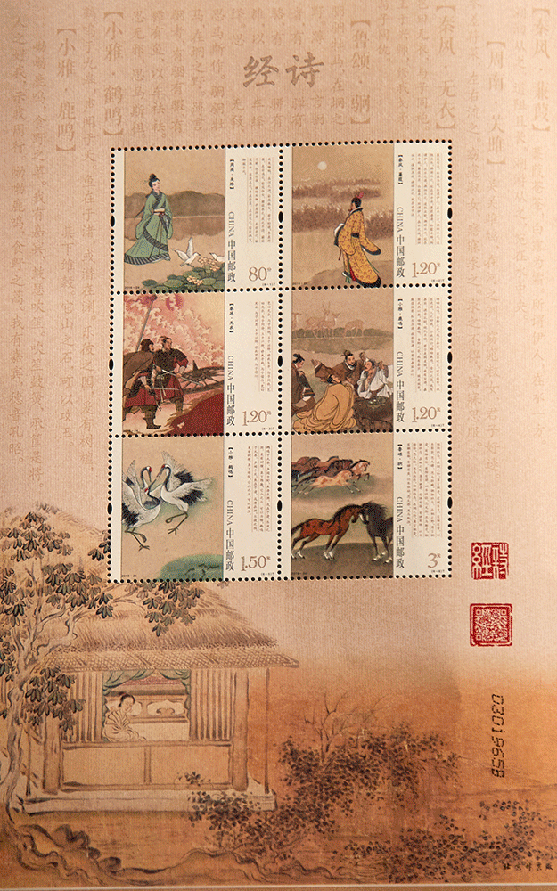 诗经系列以山水画为背景,小全张形式设计,6枚邮票涵盖了《风》、《雅》、《颂》三部曲,从闲适人间到纷乱战场,再到自然生灵,刻画了那个时代的雅致与壮阔。
