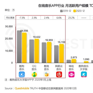 根据QuestMobile数据,截至2020年12月,在线音乐APP行业月活跃用户规模TOP10里,腾讯音乐旗下的酷狗音乐、QQ音乐、酷我音乐包揽前三,居第一梯队,网易云音乐紧随其后,位居第二梯队,咪咕音乐、爱音乐、DJ多多、5sing原创音乐居第三梯队,且各梯队之间仍有量级差距。