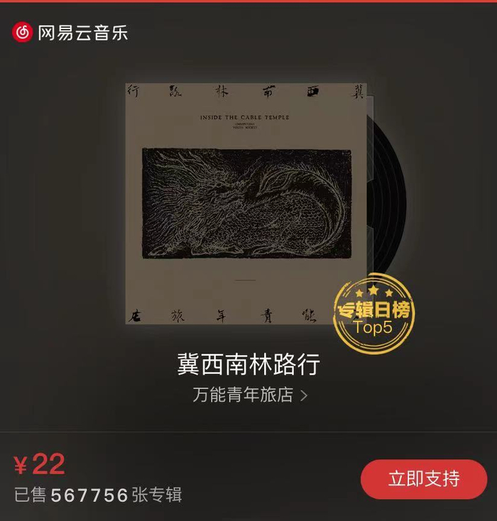 网易云音乐在2020年创造了一个关于独立音乐的现象级案例。万能青年旅店发行的第二张专辑《冀西南林路行》,专辑上线1日,销售总量即突破30万张,并很快打破国内独立音乐市场数字专辑销量纪录。上线一周后专辑销量超过41万张,销售额超过895万元,以独立音乐数字专辑罕见的势头,引发全网讨论胜景。
