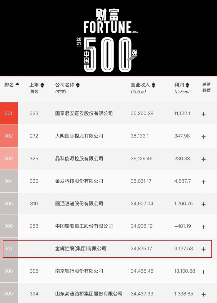 2021年度《财富》中国500强企业排行榜于7月底正式公布,刚刚于2020年上市的金辉控股(集团)有限公司(09993.HK,以下简称金辉控股)首次进入榜单,位列第307位。
