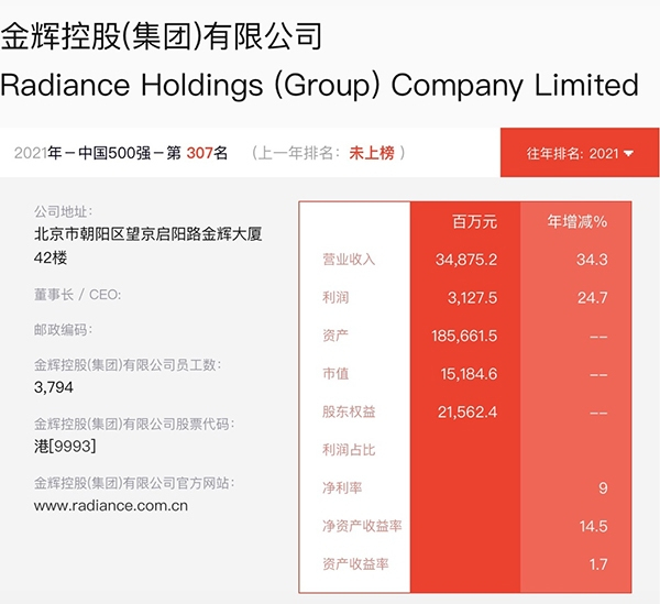 由于2020年10月金辉控股刚刚完成港股IPO成为上市企业,因此本年度金辉控股第一次成为《财富》中国500强榜单的候选目标企业。凭借2020年度优异的业绩表现,首次上榜便登上307位的高位。