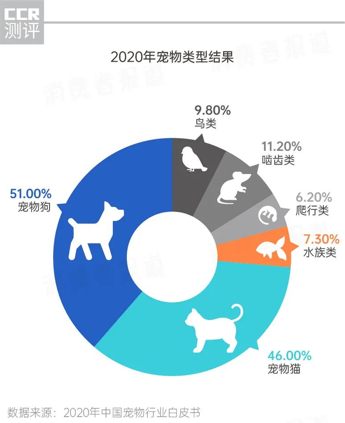 宠物种类方面,有人喜欢忠诚憨厚的狗狗,有人喜欢傲娇软萌的猫咪,有人喜欢逗鸟观鱼,还有人喜欢守宫、绿鬃蜥等爬宠。《2020年中国宠物行业白皮书》显示,家养宠物中,养宠物狗的比例为51%,养宠物猫的比例为46%,如仓鼠之类的啮齿类动物占11.2%。