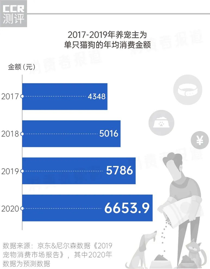 养宠之后自然少不得各种“买买买”。根据京东联合尼尔森数据推出的《2019宠物消费市场报告》,养宠主为单只猫狗的人均年消费金额在逐年上升,2020年约达6653.9元。