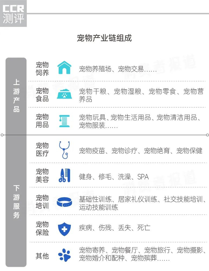 目前,宠物产业链可主要分为上游产品、下游服务两类。上游产品包括宠物交易、宠物食品、宠物用品等,下游服务则包括宠物医疗、宠物美容、宠物培训、宠物保险等一系列衍生服务类产品。