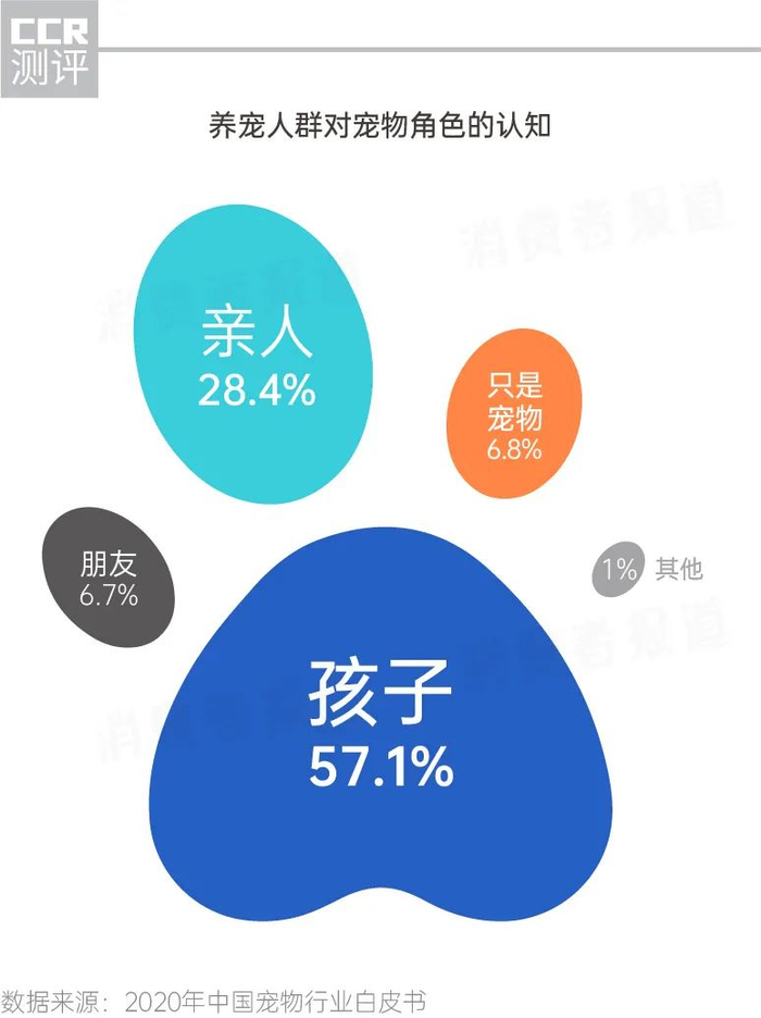 《2020年中国宠物行业白皮书》显示,57.1%的养宠主把宠物看作是孩子,28.4%的把宠物看作是亲人,还有6.7%把宠物当做朋友看待,仅有6.8%的受访者觉得宠物“只是宠物”。在网上,甚至有不少网友戏称宠物才是主人,自己只是“主子”的铲屎官。