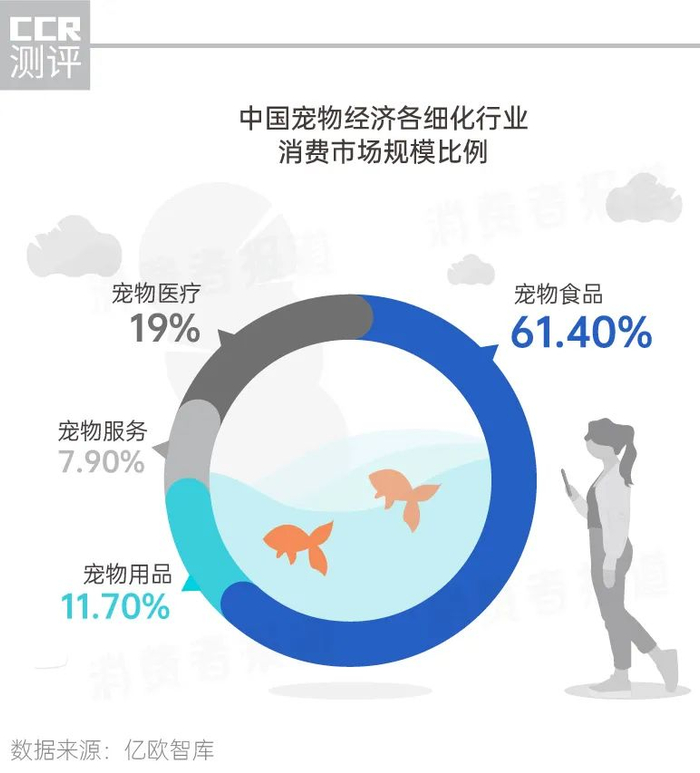 数据显示,各类细化消费者市场中,宠物食品在宠物行业中的市场占比最高,约占61.4%,其次为宠物医疗和宠物用品,宠物服务居末位。