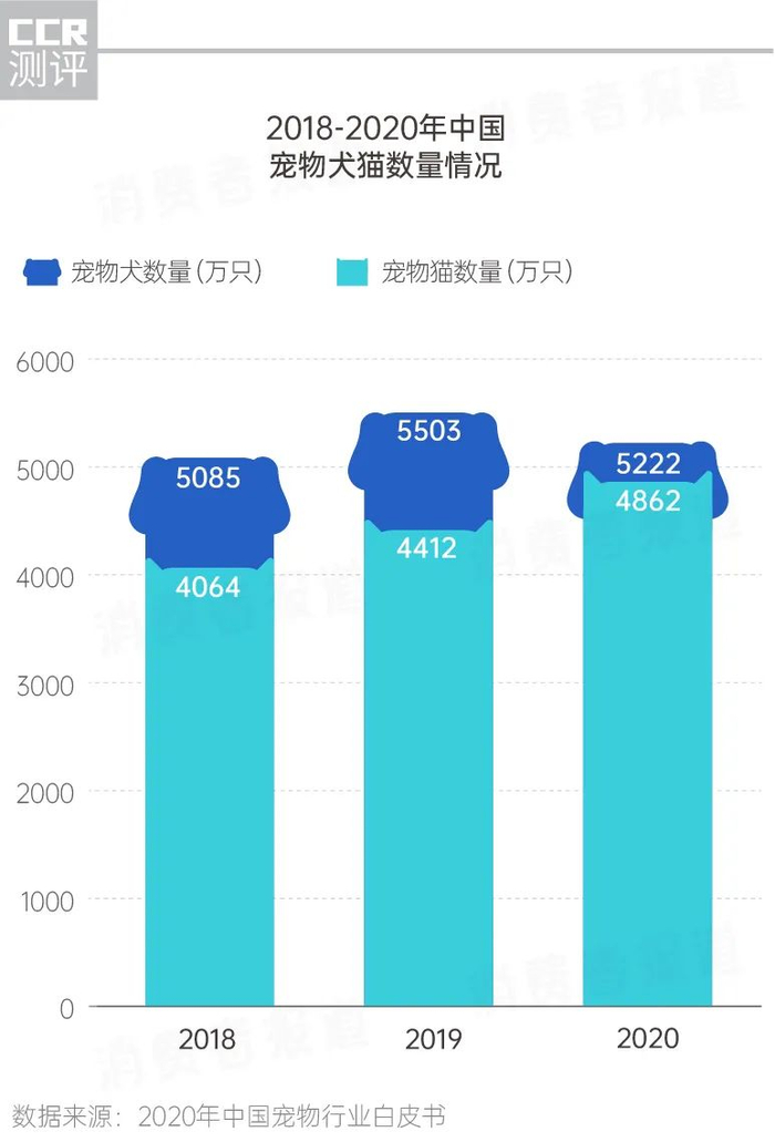 总的来说,宠物狗和宠物猫是当前宠物界的主流。近年来,喂养成本和时间成本更低的猫咪更是越来越受到职场白领和学生的喜欢。根据白皮书的数据,2020年宠物狗数量从2019年的5503万只下降到5222万只,而宠物猫的数量则从2019年的4412万只上升至4862万只。