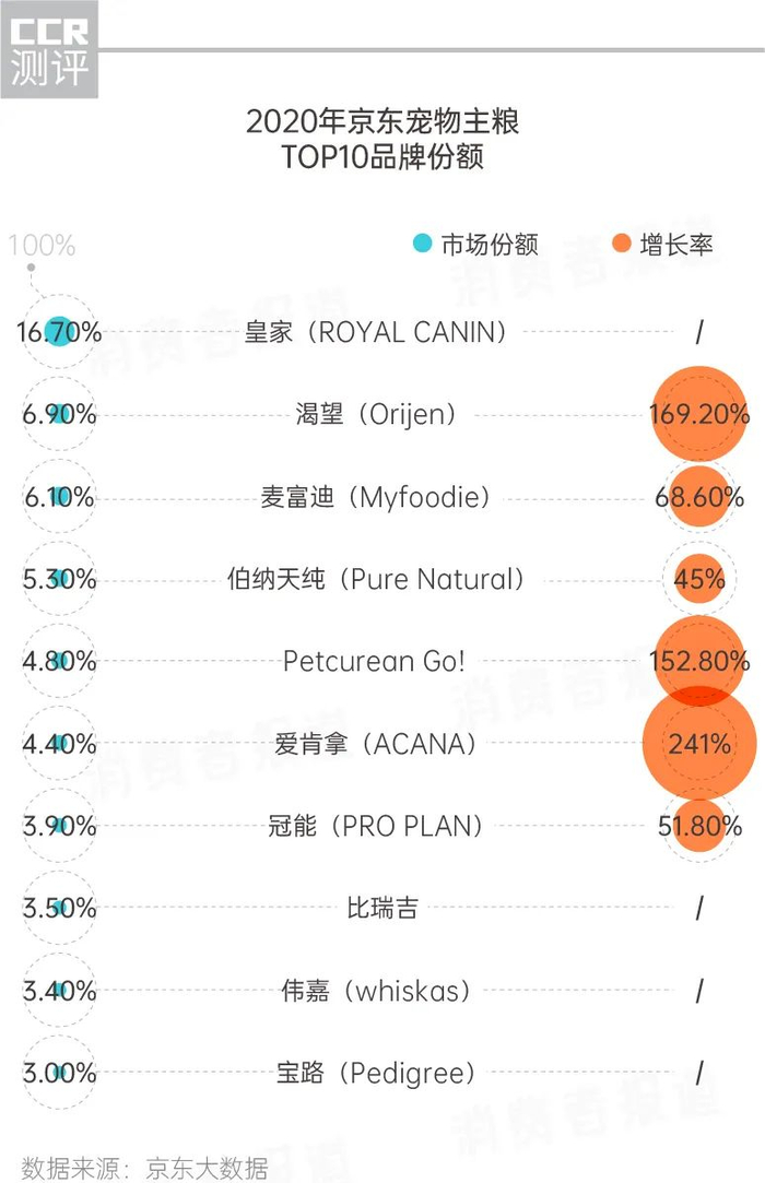 从全年的市场表现来看,海外品牌仍占据主流,玛氏旗下的皇家在京东平台上所占市场份额最大,为16.7%,同属玛氏集团的伟嘉、宝路,市场份额在3%以上;渴望、GO!、爱肯拿等加拿大品牌也榜上有名。另一方面,麦富迪、伯纳天纯等国产品牌市场份额在5%以上,增长率分别为68.7%和45%。