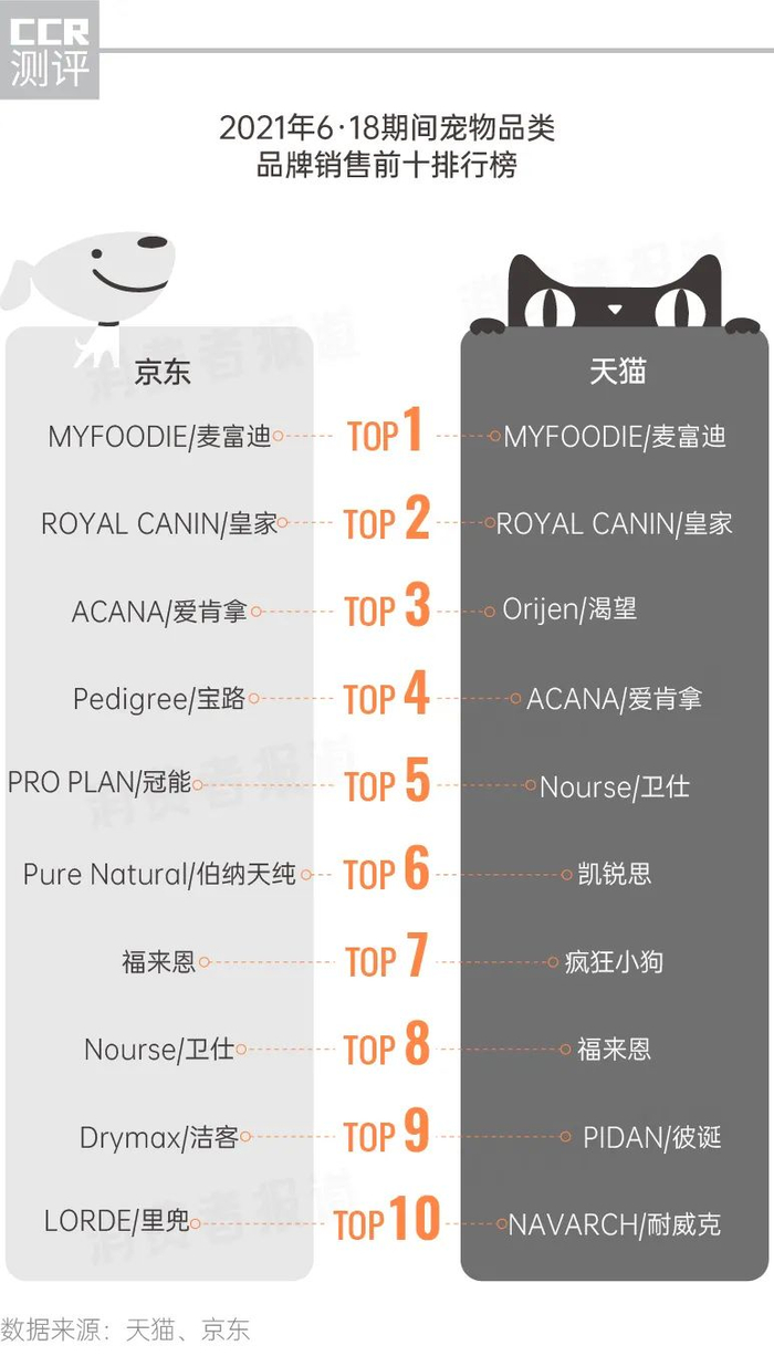 在6·18宠物品类销售前十品牌排行榜中,上榜的11个宠物食品品牌中,麦富迪、卫仕、凯锐思、疯狂小狗、耐威克、伯纳天纯等6个品牌为国产品牌;另外的5个品牌为国外品牌,其中皇家、宝路都是玛氏旗下品牌,冠能是雀巢旗下品牌,而渴望、爱肯拿为加拿大品牌。