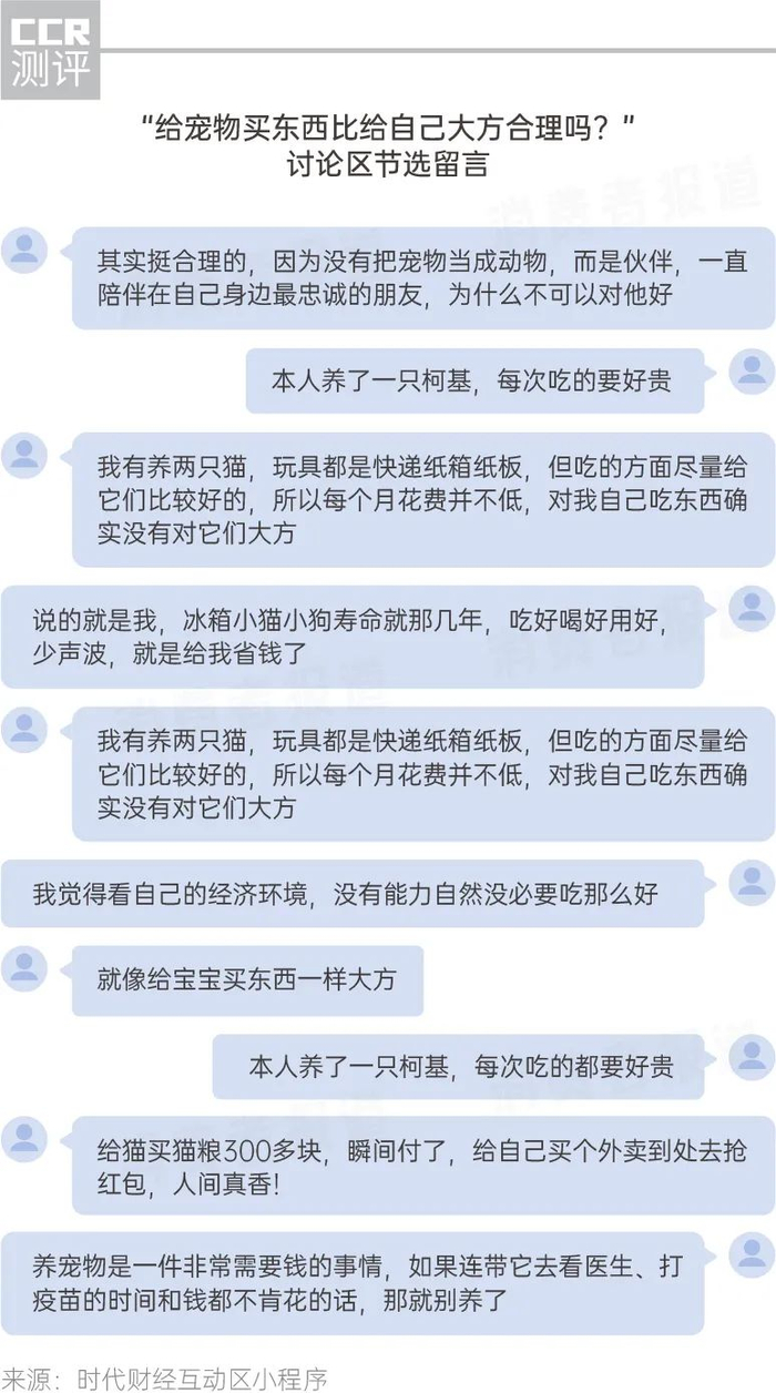 此前,在时代财经互动区上有这么一则关于“给宠物买东西比自己大方合理吗?”的话题讨论,有网友觉得“吃的方面尽量给它们比较好的”“毕竟我们是在宠物身上寄托情感的,也是一条小生命,所以宁愿自己少花点也想让它过得舒适一点”;也有网友指出“我们养宠物,最好是量力而行,而且真正的宠物食品和宠物用品价格都有点虚高,不能只看宣传,只要适合自己养的宠物都是没问题的”。