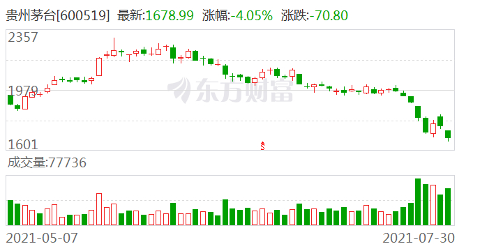 消费股又回到一片飘绿。7月30日,上证消费80指数报收7261.68点,跌幅2.06%;沪指报收3397.36,跌幅0.42%。茅台报收1678.99元,跌幅4.05%,年初,茅台股价一度攀至2776.74元的高位。