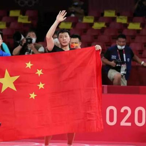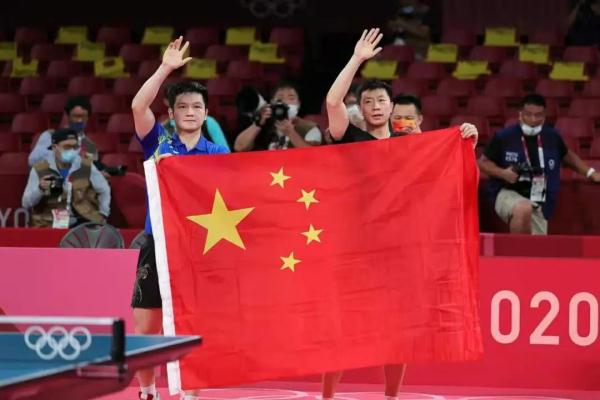 7月30日,马龙(前右)和樊振东在比赛后共展国旗。