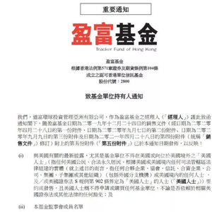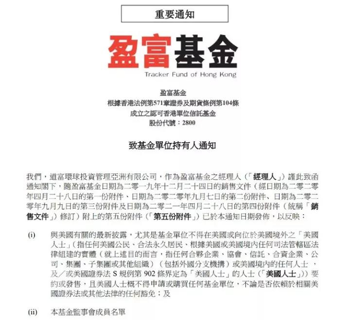 7月29日晚,香港最大的ETF盈富基金发布公告,禁止“美国人士”购买该基金单位。