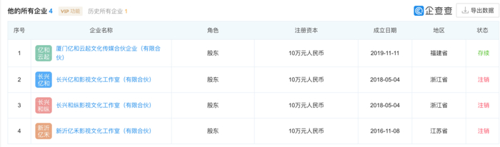 企查查显示,吴亦凡(WU YI FAN)共关联4家企业,其中存续状态仅1家,为厦门亿和云起文化传媒合伙企业(有限合伙),持股比例为99.99%,法定代表人为其表哥吴林。其余3家显示已注销,注销时间集中在2020年6月至9月,此前吴亦凡持股比例均为99.0%及以上。