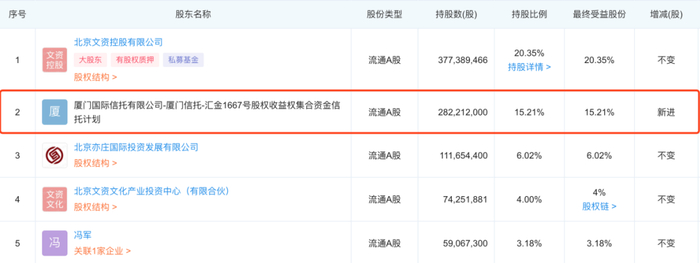 今年3月1日,文投控股公布称,依据北京市第二中级人民法院执行裁定,耀莱文化持有的公司2.82亿股无限售条件流通股股票已于2021年3月1日完成划转,股份受让人为厦门国际信托有限公司-厦门信托-汇金1667号股权收益权集合资金信托计划。本次股份过户完成后,耀莱文化持股比例降为1.14%,厦门信托持股比例15.21%。