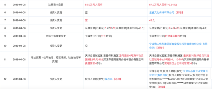 不过,个人品牌A.C.E.的创业成绩并不突出,运营不足5个月后吴亦凡退出股东行列。接替加入的有天津米小福企业管理合伙企业(有限合伙)、宁波梅山保税港区泛音堂股权投资管理合伙企业(有限合伙)、星睿文化传媒有限公司,后两者中,一个由吴亦凡表哥吴林出资80%,一个则为吴亦凡实际控制公司。