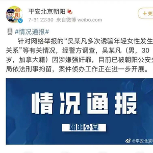 7月31日,针对网络举报的“吴某凡多次诱骗年轻女性发生性关系”等有关情况,经警方调查,吴某凡(男,30岁,加拿大籍)因涉嫌强奸罪,目前已被朝阳公安分局依法刑事拘留,案件侦办工作正在进一步开展。