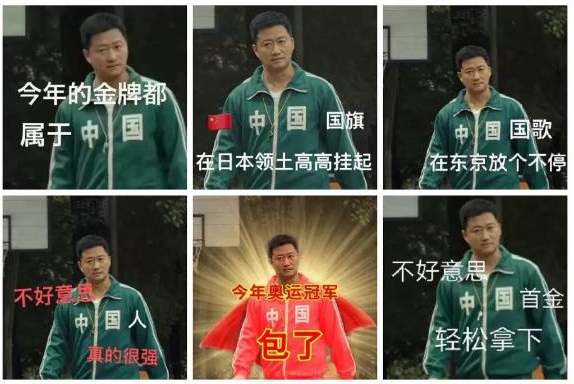 乒乒乓乓一上手,中国打到没朋友;没有实力你别犟,中国举重全猛将;十环靶心是沧桑,中国射击就是刚;花花世界迷人眼,中国体操实力显;让中国国旗在日本领土高高挂起;让中国国歌响彻东京奥运……
