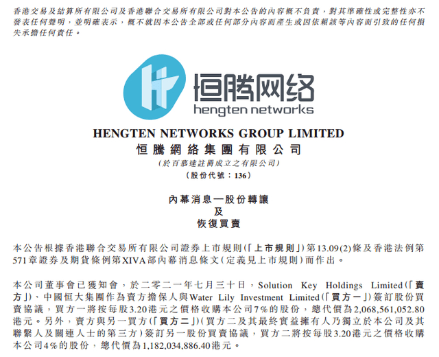 8月1日晚间,恒腾网络港交所公告称,中国恒大以32.5亿港元价格出售恒腾网络合计11%股权。
