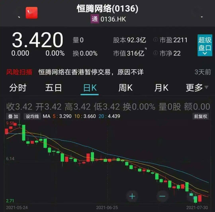 但是截至目前,恒腾网络的股价报收3.42港元,较柯利明6港元的收购价格跌去了43%。这意味着柯利明的这笔投资账面浮亏已经超过19亿港元。