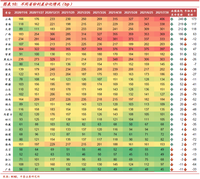 永煤违约后,各省利差普遍走阔,但随着城投“抱团”趋势演化,不同区域呈现信用分层。云南、青海、天津、广西、贵州和甘肃等省区的利差继续走阔,其余省区今年以来利差呈收窄趋势。