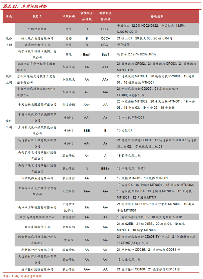 本周有19家信用债发行人主体评级发生下调,3家发行人主体评级发生上调。其中,恒大地产境外评级被下调。