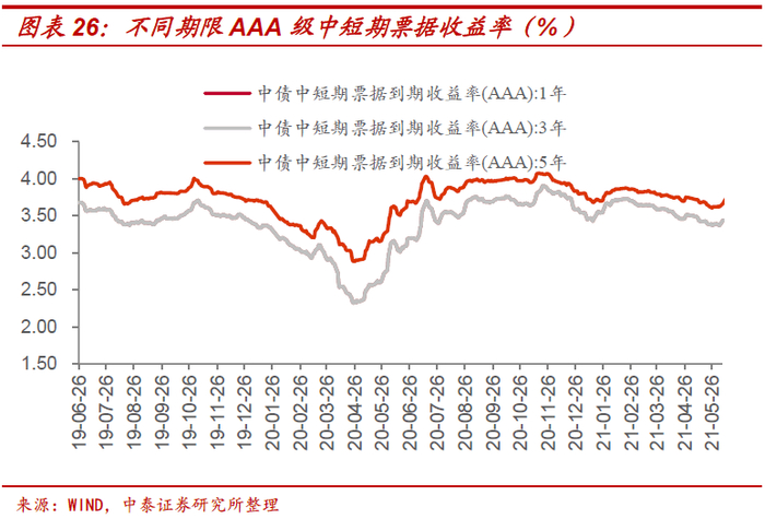 本周1年期和5年期中短票据收益率下行,3年期中短票据收益率上行。具体来看,本周AAA评级1年期、3年期和5年期中短票据分别收于2.70%、3.09%和3.36%,分别较上周变动-4.80bp、8bp、-19.40bp。