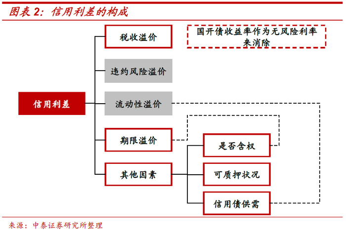 城投债与产业债的信用利差均由税收溢价、违约风险溢价、流动性溢价、期限溢价等构成。具体来看,城投债信用利差影响因素主要包括由政府及城投企业自身信仰主导的违约风险溢价,并受到流动性溢价、期限溢价、税收溢价、含权因素和债券供需等其他因素影响。其中,税收因素已通过使用国开债收益率作为无风险利率来消除;其余因素之间存在较高的相关性,比如违约风险溢价与流动性溢价,债券供需因素与流动性溢价,期限溢价与含权因素等。