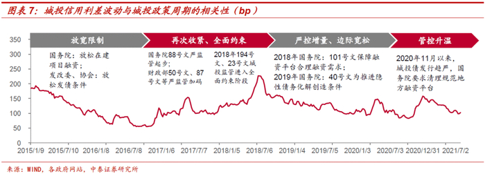 城投债信用利差总体走势与监管政策周期密切相关。我们梳理了2015年以来城投利差与城投监管政策变动情况: