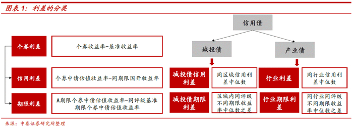 对于信用债,利差在微观层面上指个券利差或主体利差,即个券收益率减去基准收益率。在中观层面上,信用债又可进一步分为产业债和城投债,由不同行业中的产业债可构成行业利差,由不同区域的城投债可形成区域利差。在宏观层面上,利差又分为信用利差和期限利差。我们新建的城投数利差据库中除了信用利差外,同时加入了期限利差,以更好的为个券投资价值分析提供参考。