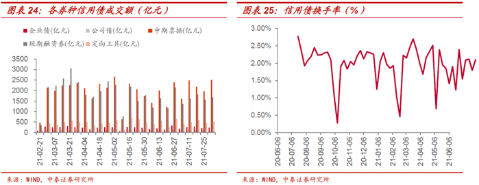 本周信用债市场成交活跃度有小幅回升。本周信用债周度换手率为2.10%,较上周上升0.30个百分点。分券种看,企业债、公司债、中期票据、短期融资券和定向工具成交量分别为238.56亿元、83.5亿元、2513.35亿元、1676.62亿元和527.18亿元,除公司债成交量较上周有所下降外,其余券种成交量均有一定程度回升。