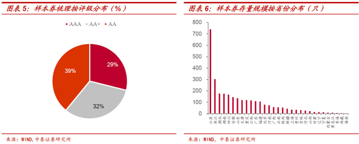 基于上述条件,我们每周对最后一个交易日的存量城投债进行动态筛选,不同交易日的样本债券不完全相同。以2021年7月30日为例,筛选后我们一共得到2992只样本券,其中AAA、AA+和AA的债券分别为865只、958只和1169只;符合条件的存量城投债数量居前三的省份分别为江苏省、浙江省和湖北省,分别有740只、303只和176只样本债券。