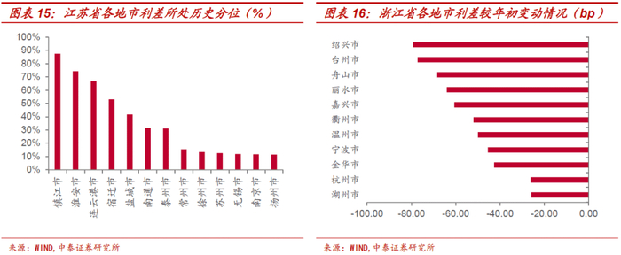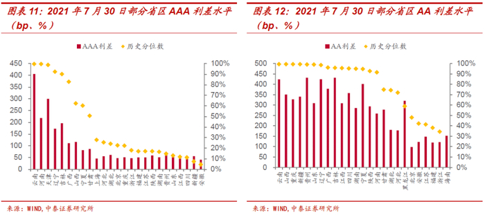 分地市看,省内不同地市之间利差水平亦存在分化,在上半年城投“抱团”演化下,西南、东北区域地市的信用利差普遍处于历史高位,江苏、山东、河南等省份部分地市的利差水平也相对较高。