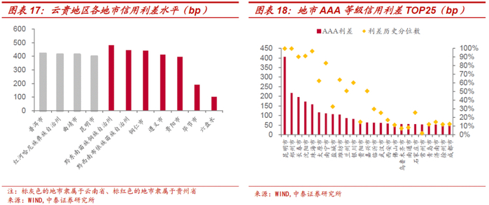 年初至今,多数地市利差总体收窄,区域内信用分化较为明显。我们选取江浙两地代表强区域,选取河南、山东省代表中等资质区域,另外选取云南省、贵州省作为净融资为负区域的代表。浙江省尚有存续债的11个地市的信用利差均较年初均大幅收窄;江苏省除了镇江市利差较年初走阔33bp、淮安市利差较年初变化不大外,其余11个地市利差收窄幅度也较为明显。镇江市、淮安市利差分处于87%和74%历史分位,而南京、苏州市、无锡市、扬州市和徐州市利差处于15%以下历史分位,强区域内亦存在信用分层。昆明市信用利差较年初大幅走阔207bp至399bp,接近历史最高位,贵州市多个地市利差处于90%以上历史分位,弱区域再融资压力不减。山东省、河南省在区域利差总体收窄的背景下,部分地市利差走阔明显,例如郑州市AAA信用利差较年初走阔116bp至218bp,菏泽市AA利差走阔84bp至478bp,潍坊市AAA、AA+城投利差水平亦较高。