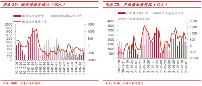 2021年以来,城投债信用利差走势与信用收缩出现背离,我们认为主要有以下两个原因:1)永煤违约、华晨破产重组等一系列风险事件对信用债市场冲击较大,尤其是对产业债市场,在欠配压力下,城投债作为相对安全的资产受到投资者青睐;2)2021年上半年虽然城投监管升温,但中央也重点强调了防范债务风险,各地政府主动维稳、相继表态,尤其突出了对于债券领域风险防控的关注。投资者信心有所恢复,年初城投打破刚兑的预期下降。